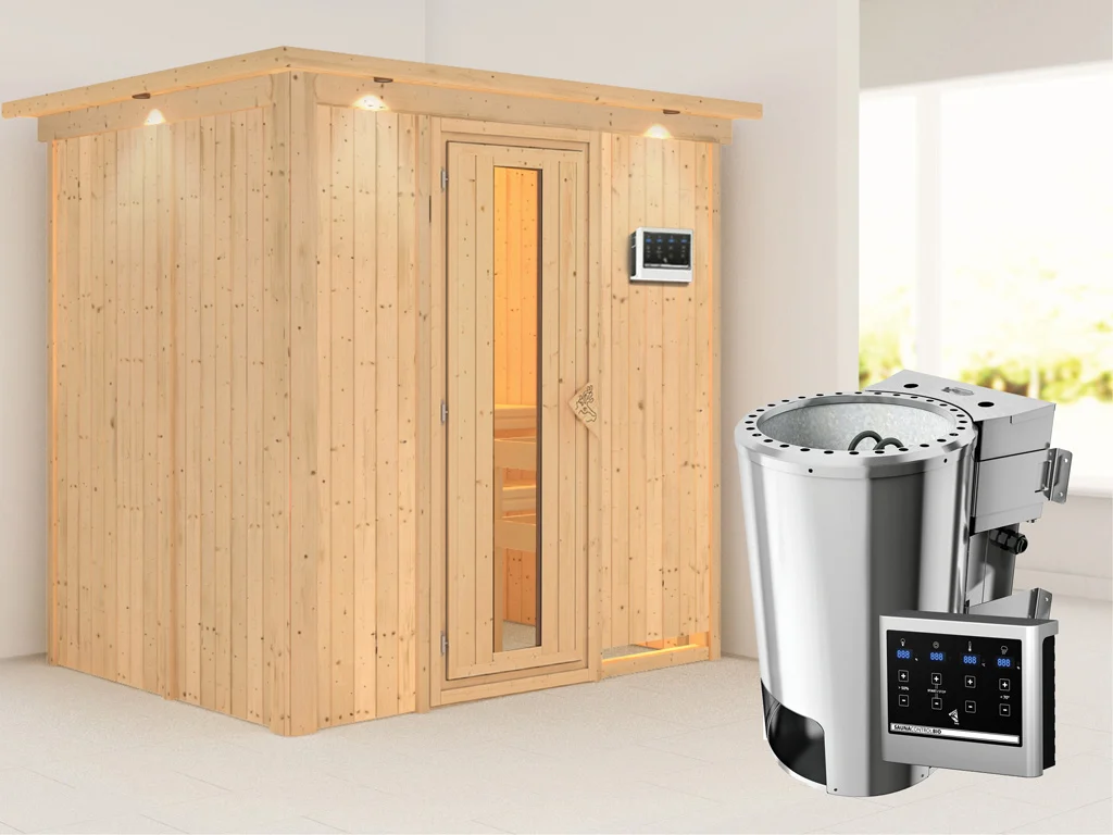 Diese Innensauna wird mit Saunaofen und einer externen Steuerung geliefert. Die Anbringung des Steuergerätes erfolgt an der Außenseite der Sauna. Ganz komfortabel kann somit die Saunasteuerung von außen erledigt und die Temperatur exakt bestimmt werden. Zusätzlich verfügt das Steuergerät über eine Anschlussstelle, über die ein weiteres elektrisches Gerät bedient werden kann.