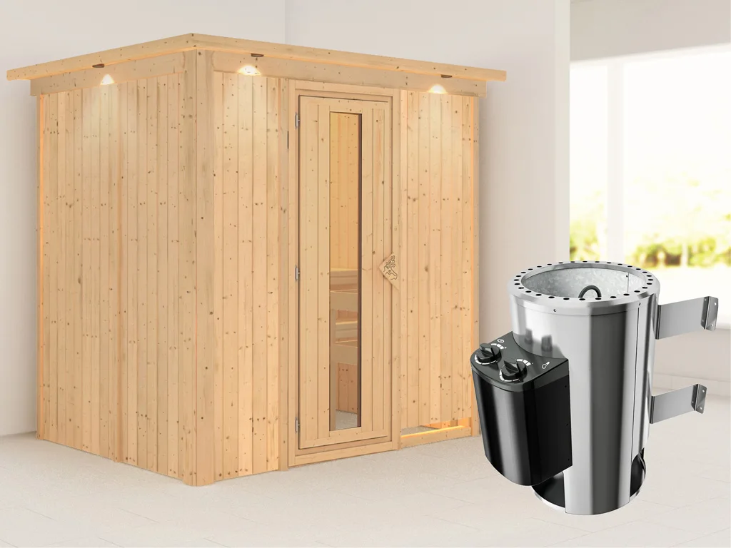 Bei dieser Sauna ist ein Saunaofen mit integrierter Steuerung inklusive. Die Steuerung ist direkt am Ofen verbaut und lässt sich durch praktische und robuste Drehschalter besonders leicht bedienen. Die preisgünstige Variante der Saunasteuerung vereint alles in einem – Ofen und integrierte Steuerung.