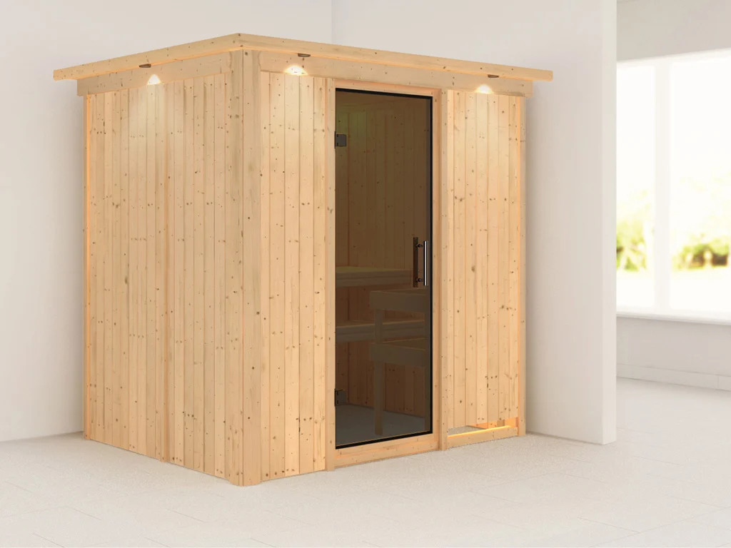 Dieses Saunamodell – eine System- bzw. Elementsauna – zeichnet sich durch seine besondere Sandwich-Bauweise aus, d.h. die Wandelemente bestehen aus einzelnen Schichten. Die bereits vorgefertigten Wandelemente ermöglichen einen schnellen Aufbau innerhalb weniger Stunden.