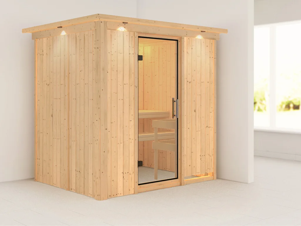 Dieses Saunamodell – eine System- bzw. Elementsauna – zeichnet sich durch seine besondere Sandwich-Bauweise aus, d.h. die Wandelemente bestehen aus einzelnen Schichten. Die bereits vorgefertigten Wandelemente ermöglichen einen schnellen Aufbau innerhalb weniger Stunden.