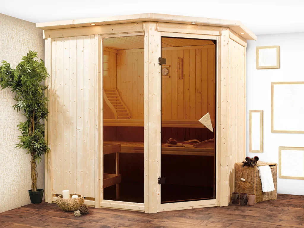 Bei der Montage einer Sauna muss ein Mindestabstand von 10 cm zu Wänden und Decke unbedingt eingehalten werden, um gute Luftzirkulation zu gewährleisten. So kann feucht-warme Luft besser abziehen. In diesem Zusammenhang müssen die Mindestraumhöhe und -breite beachtet werden.