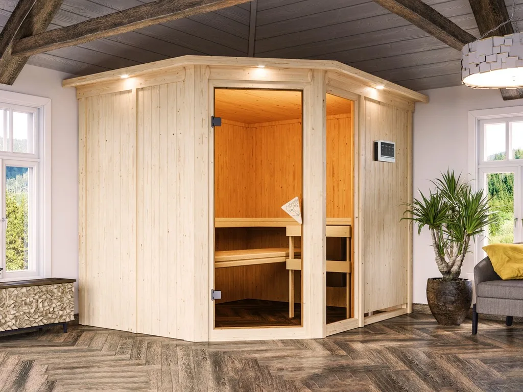 Diese Innensauna wird mit Saunaofen und einer externen Steuerung geliefert. Die Anbringung des Steuergerätes erfolgt an der Außenseite der Sauna. Ganz komfortabel kann somit die Saunasteuerung von außen erledigt und die Temperatur exakt bestimmt werden. Zusätzlich verfügt das Steuergerät über eine Anschlussstelle, über die ein weiteres elektrisches Gerät bedient werden kann.