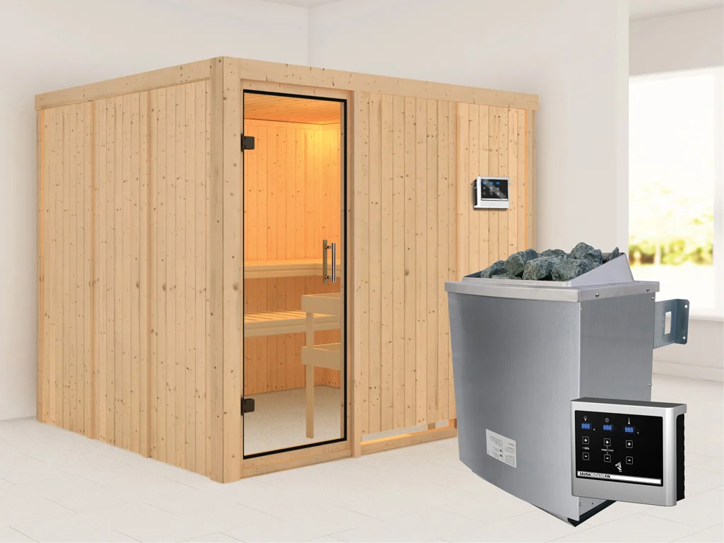 Bei dieser Innensauna ist ein Saunaofen mit einer externen Steuerung inklusive. Das Steuergerät wird außerhalb der Sauna angebracht. Auf diese Weise fängt schon vor dem Saunieren der Komfort an – mit einer bequemen Bedienung von außen und einer noch exakteren Temperatureinstellung. Weitere elektrische Geräte, wie die Kabinenbeleuchtung, können ebenso an die externe Steuerung angeschlossen und bedient werden.