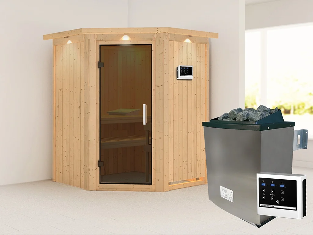 Sauna Systemsauna Larin mit Dachkranz, inkl. 9 kW Ofen mit externer Steuerung