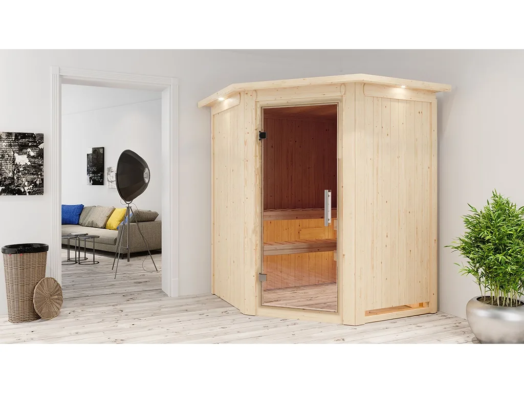 Sauna Systemsauna Larin mit Dachkranz, inkl. 9 kW Ofen mit integrierter Steuerung
