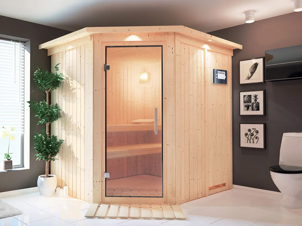 Diese Innensauna wird mit Saunaofen und einer externen Steuerung geliefert. Die Anbringung des Steuergerätes erfolgt an der Außenseite der Sauna. Ganz komfortabel kann somit die Saunasteuerung von außen erledigt und die Temperatur exakt bestimmt werden. Zusätzlich verfügt das Steuergerät über eine Anschlussstelle, über die ein weiteres elektrisches Gerät bedient werden kann.