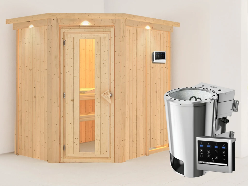 Diese Innensauna wird einschließlich Saunaofen mit externer Steuerung geliefert. Die Anbringung an der Außenseite der Sauna ermöglicht eine praktische Bedienung vor dem Saunieren und eine noch exaktere Einstellung der Temperatur. Weitere elektrische Geräte, wie eine Kabinenbeleuchtung, können ebenso an die externe Steuerung angeschlossen und mit dieser bedient werden.