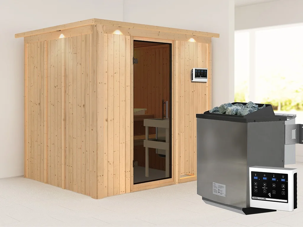 Sauna Systemsauna Sodin mit Dachkranz, inkl. 9 kW Bio-Ofen mit externer Steuerung
