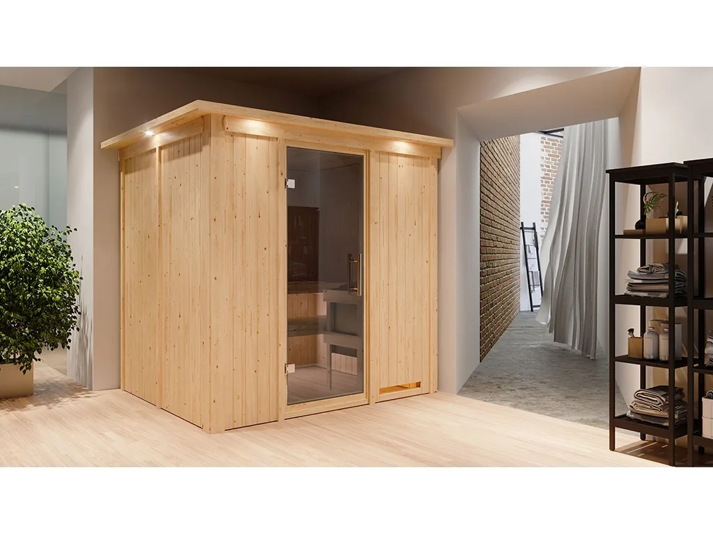 Sauna Systemsauna Sodin mit Dachkranz, inkl. 9 kW Ofen mit integrierter Steuerung