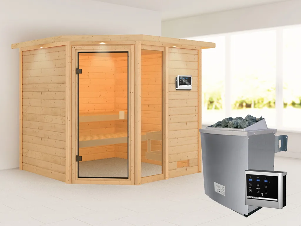 • Eckeinstieg: Diese Sauna mit Eckeinstieg eignet sich besonders gut für kleine Räume. Platzsparend und kompakt passt sie in jeden Raum und nutzt die Fläche optimal.