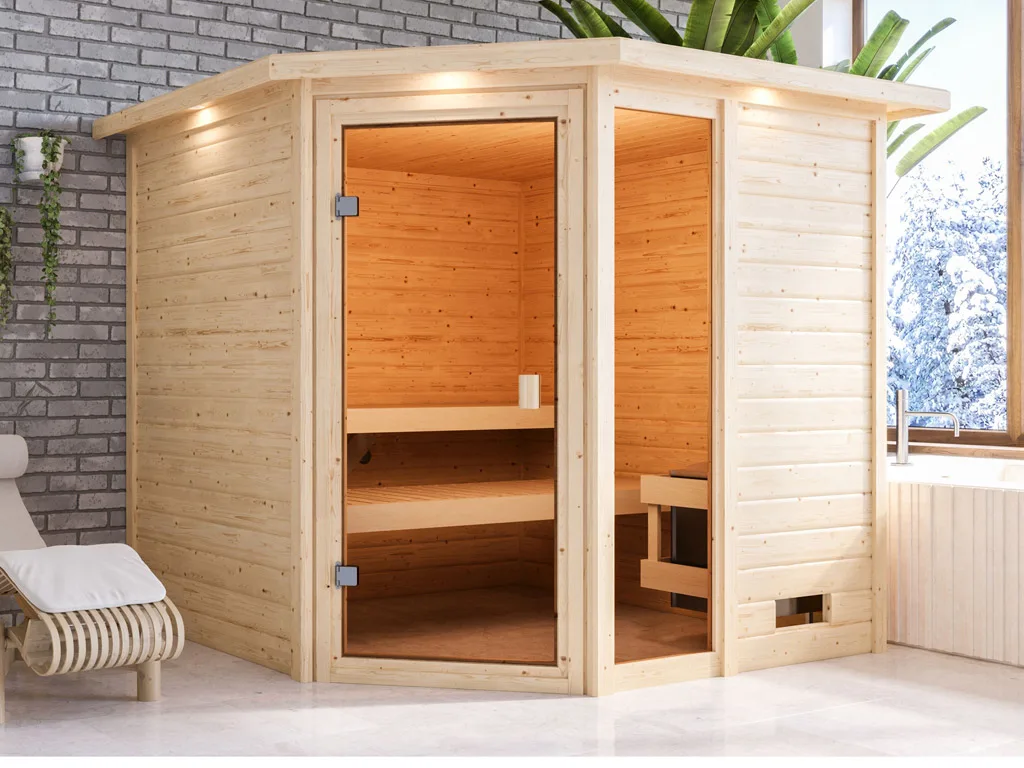 • Eckeinstieg: Diese Sauna mit Eckeinstieg eignet sich besonders gut für kleine Räume. Platzsparend und kompakt passt sie in jeden Raum und nutzt die Fläche optimal.