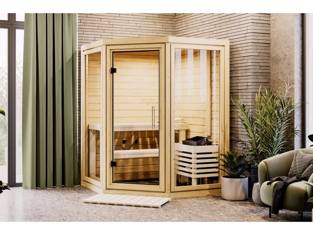 Eckeinstieg: Diese Sauna mit Eckeinstieg eignet sich besonders gut für kleine Räume. Platzsparend und kompakt passt sie in jeden Raum und nutzt die Fläche optimal.