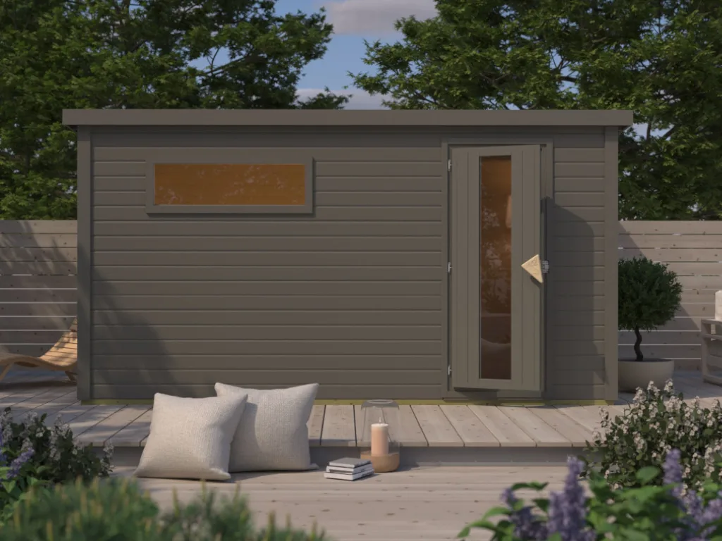 Das Saunahaus aus 38 mm starken Wandbrettern aus Fichte wird im Steck-/Schraubsystem montiert. Mit einem Gesamtmaß von 417 x 244 cm bietet es genügend Platz für ungestörte Wellnessstunden im eigenen Garten. Der Saunaraum ist mit einer Fläche von 219 x 184,5 cm natürlich ebenfalls ausreichend dimensioniert.