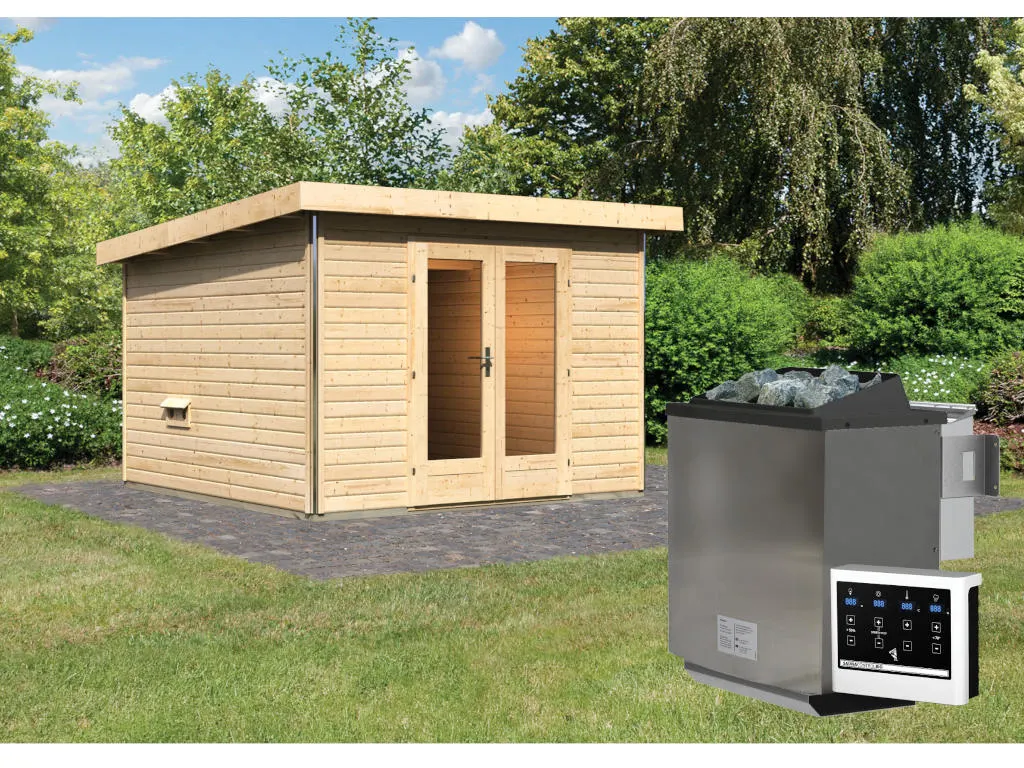 KARIBU Saunahaus Mainburg 1 naturbelassen 38 mm inkl. Bio-Kombiofen 9 kW + ext. Steuerung