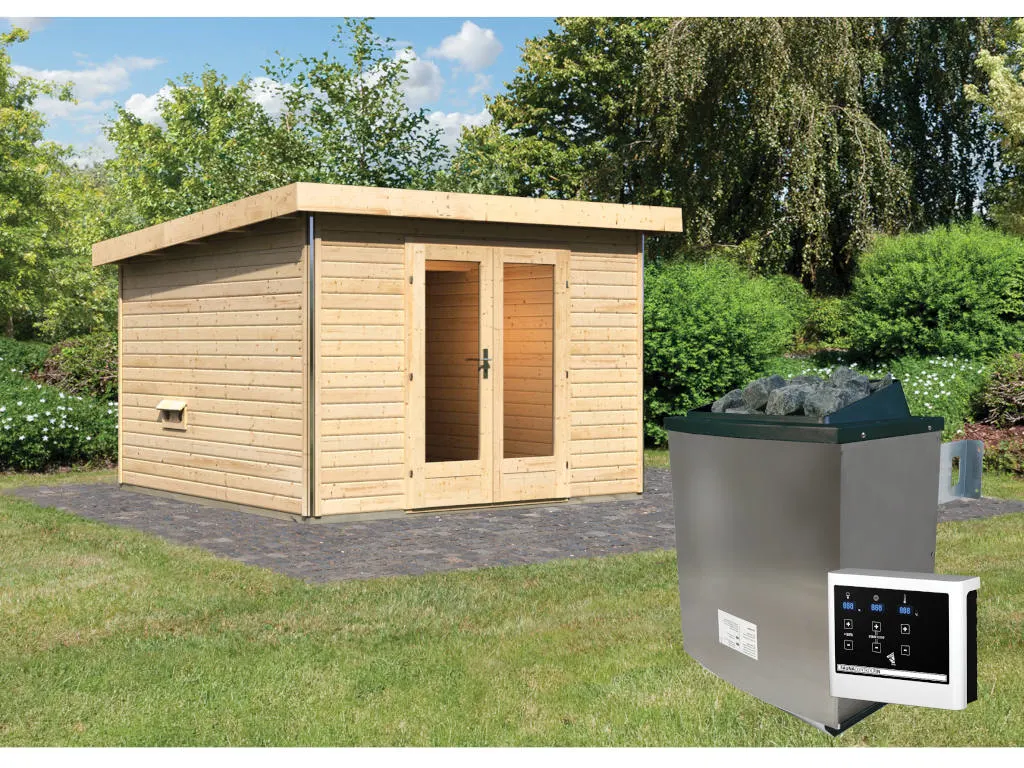 KARIBU Saunahaus Mainburg 1 naturbelassen 38 mm inkl. klassischer Saunaofen 9 kW + ext. Steuerung