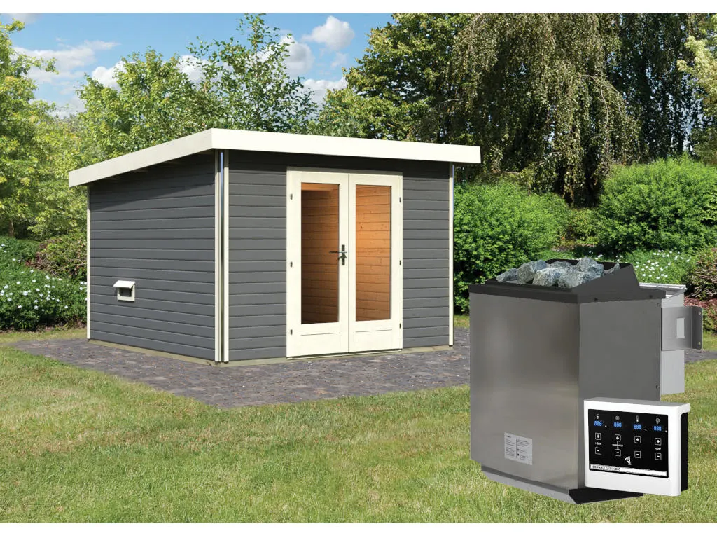 KARIBU Saunahaus Mainburg 1 terragrau 38 mm inkl. Bio-Kombiofen 9 kW + ext. Steuerung