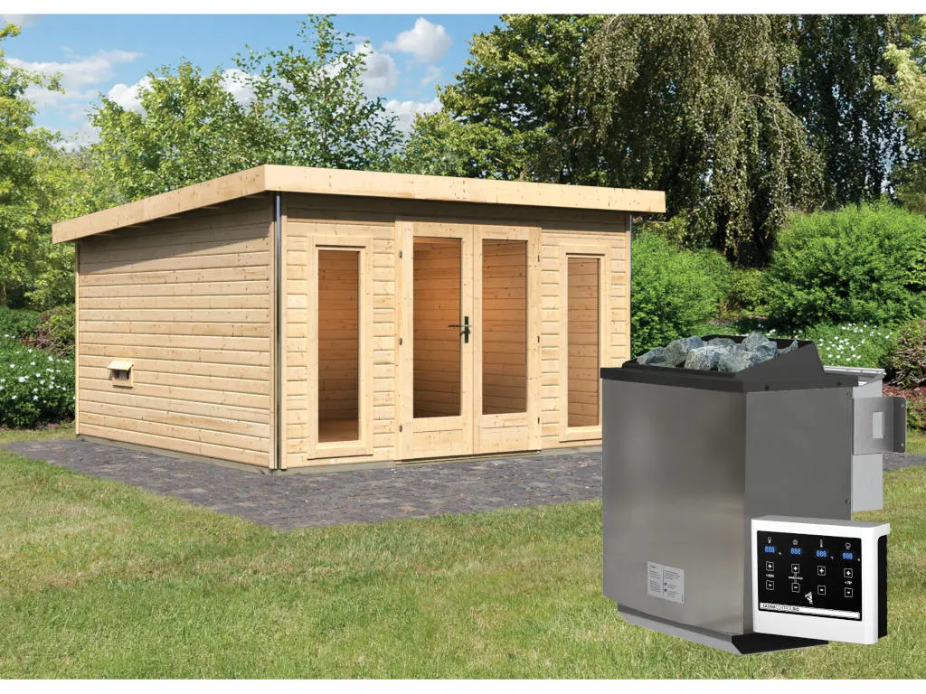 KARIBU Saunahaus Mainburg 3 naturbelassen 38 mm inkl. Bio-Kombiofen 9 kW + ext. Steuerung