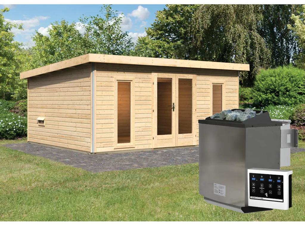 KARIBU Saunahaus Mainburg 5 naturbelassen 38 mm inkl. Bio-Kombiofen 9 kW + ext. Steuerung
