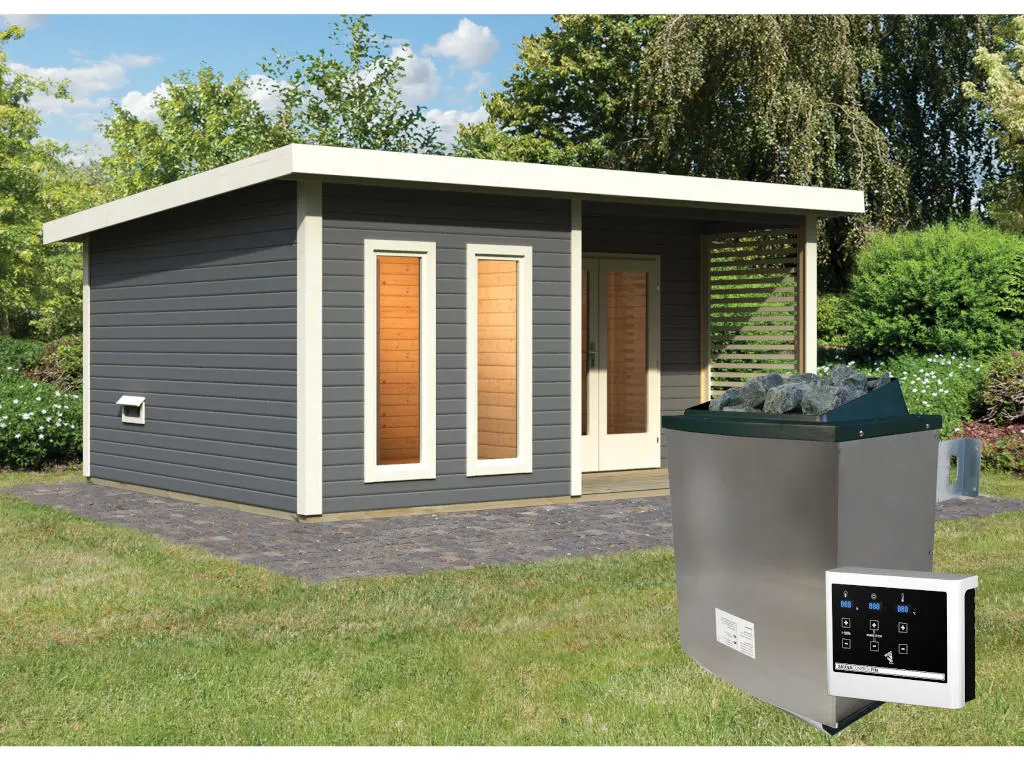 KARIBU Saunahaus Mainburg 5 terragrau 38 mm inkl. klassischer Saunaofen 9 kW + ext. Steuerung