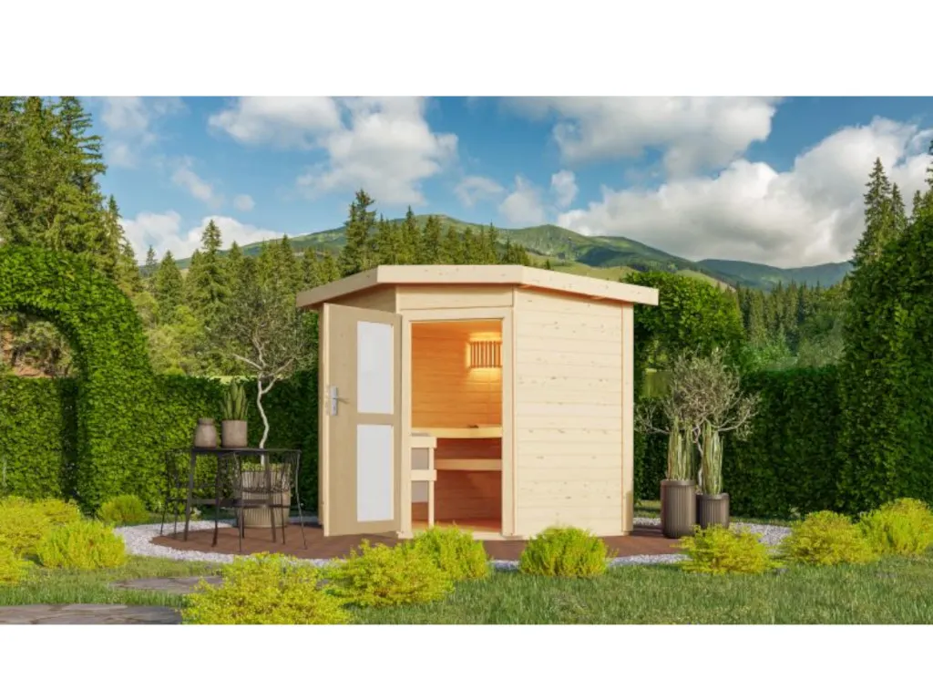 Saunahaus Mikka mit Milchglastür, inkl. 9 kW Saunaofen mit externer Steuerung