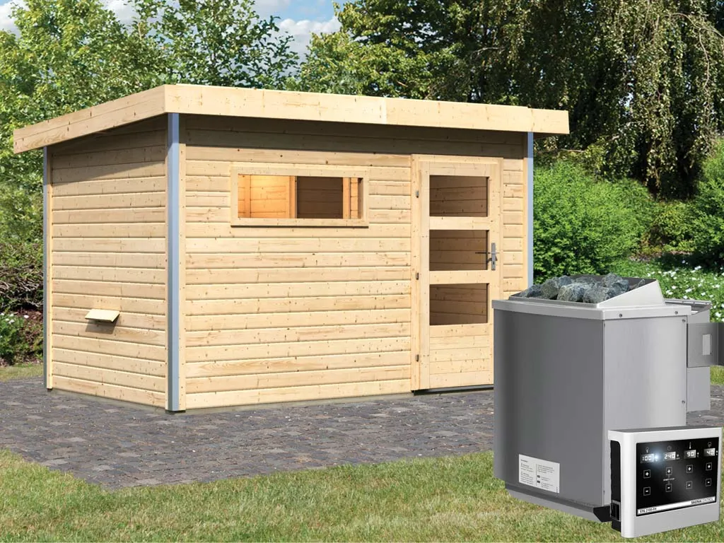 KARIBU Saunahaus "Skrollan 1" 38 mm inkl. 9 kW Bio-Kombiofen mit externer Steuerung "Easy"