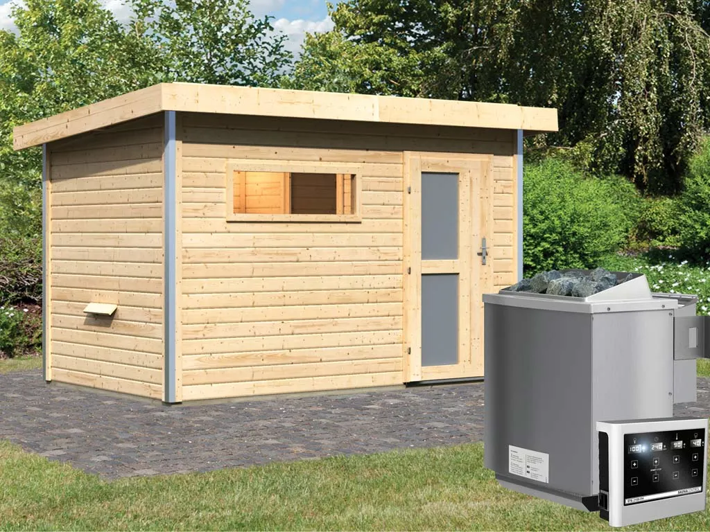 KARIBU Saunahaus "Skrollan 1" 38 mm inkl. 9 kW Bio-Kombiofen mit externer Steuerung "Easy"