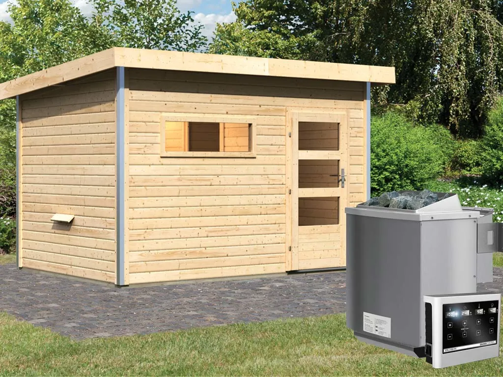KARIBU Saunahaus "Skrollan 2" 38 mm inkl. 9 kW Bio-Kombiofen mit externer Steuerung "Easy"