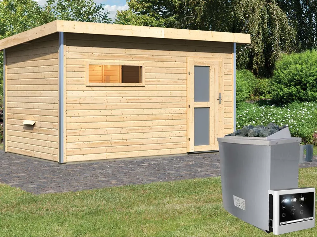 Saunahaus Skrollan 3 mit Milchglastür & Vorraum, inkl. 9 kW Saunaofen mit externer Steuerung