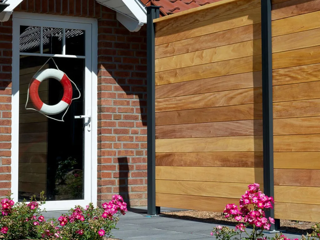 Die Kombination des warmen Werkstoffs Holz mit anthrazitfarbenen Pfosten aus Aluminium schafft einen modernen geradlinigen Gesamteindruck.