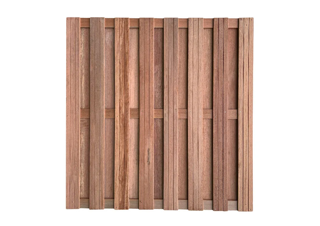 Das rötlich-braune Holz hat eine schlichte Struktur und ergibt ein ruhiges und natürliches Gesamtbild im Außenbereich.