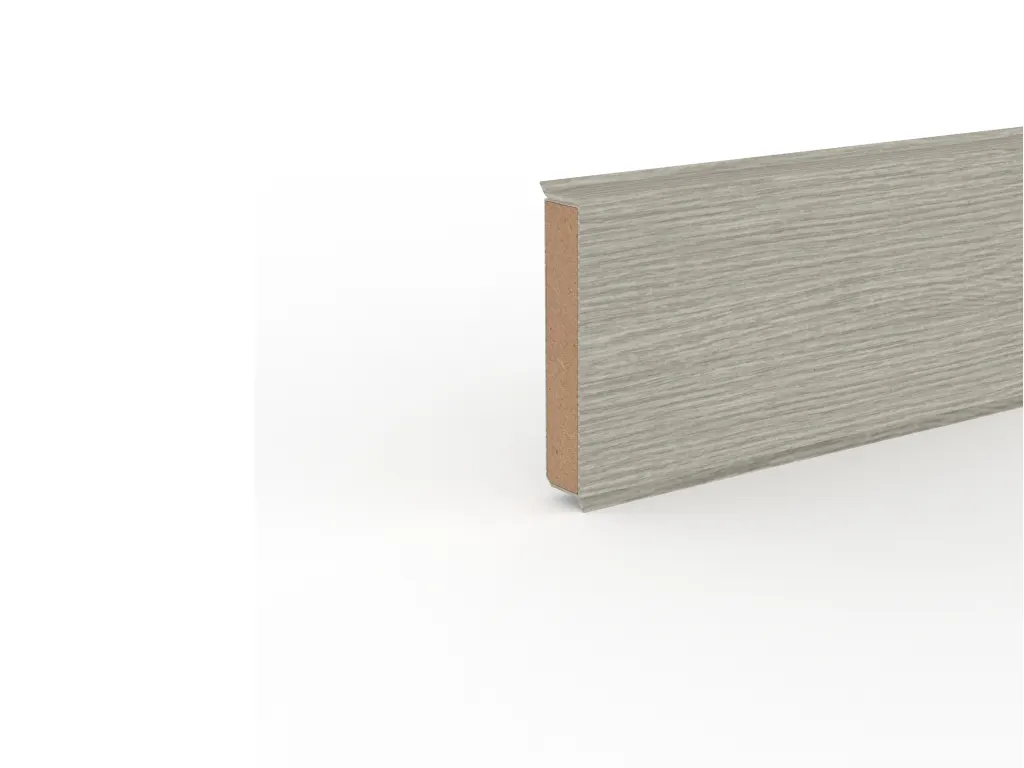 Die Sockelleiste ist 2.500 mm lang, 13 mm breit und 60 mm hoch. Sie besteht aus einem HDF-Kern, der mit chlorfreiem Polyblend auf Basis von PP/TPE ummantelt und somit besonders robust ist. Die flexible Weichlippe oben und unten passt sich mühelos möglichen Unebenheiten an Wand oder Boden an und verhindert auf diese Weise Schattenfugen sowie notwendiges Nacharbeiten mit Silikon oder Acryl. Für die Profilabschlüsse und die Bildung der Innen- und Außenecken werden keine zusätzlichen Formteile benötigt. Die Montage gelingt mit Heißschmelzkleber spielend leicht.