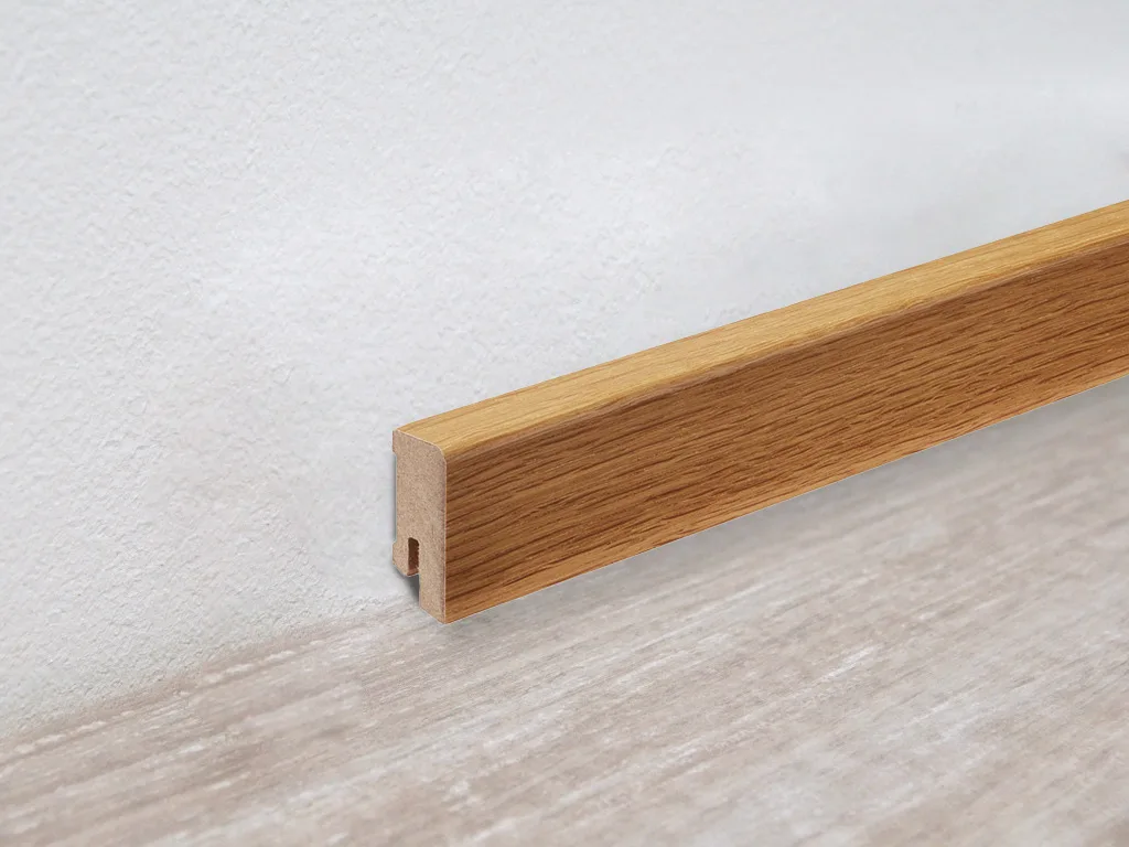 Echtholz-Leisten mit stabilem MDF-Kern für Parkett- und Furnierboden.