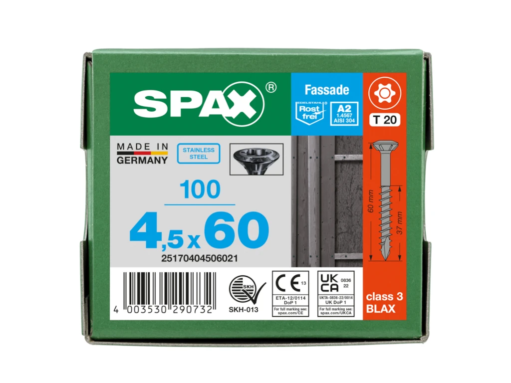 Diese speziell für Holzfassaden konzipierten Schrauben von SPAX stehen für höchste Qualität und Langlebigkeit. Gefertigt aus rostfreiem Edelstahl A2 bieten sie einen hohen Schutz vor Korrosion und eine mittlere Festigkeit. Da ihre Widerstandsfähigkeit gegenüber Säuren und Seewasser eher gering ist, gewährleisten sie eine dauerhafte und zuverlässige Verbindung abseits von Küstengebieten. Das Pack enthält 100 Schrauben, sodass du genügend Material für dein Projekt zur Hand hast. Setze auf die bewährte SPAX-Qualität und genieße deine Holzfassade in vollen Zügen!