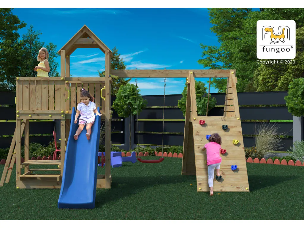 | Lieferumfang | Fluppi KDI, Einzelschaukel, 1x Schaukelsitz rot, Podestanbau, Kletteranbau m. Kletterwand+Rampe, Knotenseil, Klettersteine, Picknicktisch, Sandkasten, Leiter mit Metallsprossen, Abdeckkappen, 4x Griffe, 6x Bodenanker, 1x Lenkrad, 1x Teleskop, 1x Rutsche |