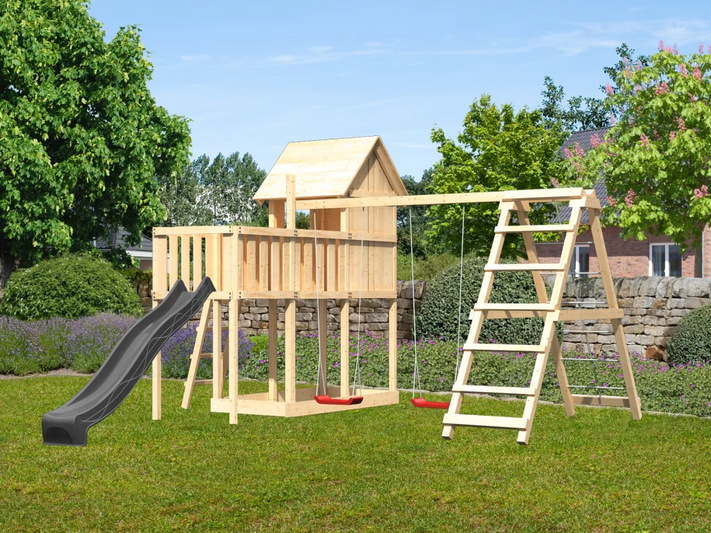 Spielturm Frieda naturbelassen inkl. Rutsche anthrazit + Doppelschaukel + Anbauplattform + Kletterwand