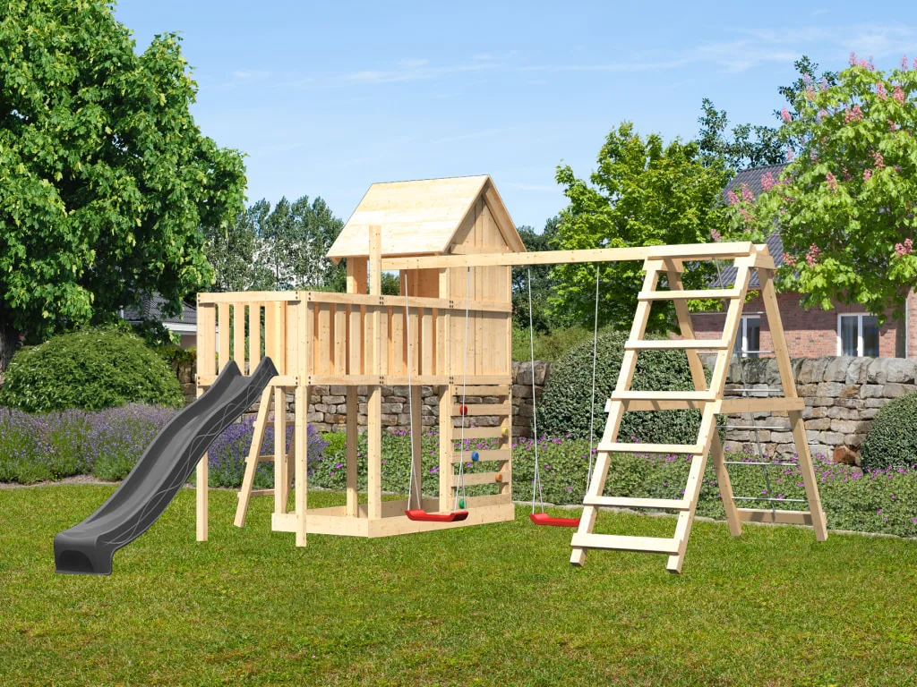 Spielturm Frieda naturbelassen inkl. Rutsche anthrazit + Doppelschaukel + Klettergerüst