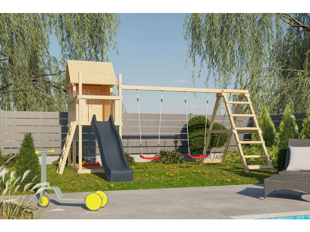 Spielturm Frieda naturbelassen inkl. Rutsche anthrazit + Doppelschaukel + Klettergerüst