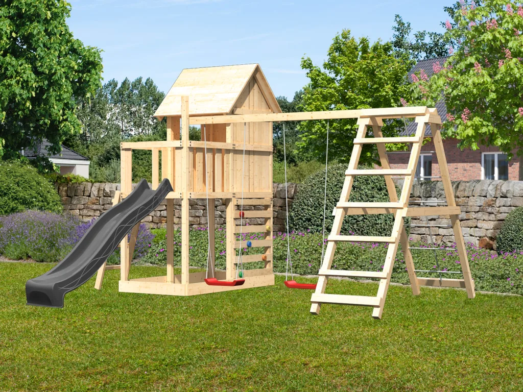 Spielturm Frieda naturbelassen inkl. Rutsche anthrazit + Doppelschaukel + Klettergerüst