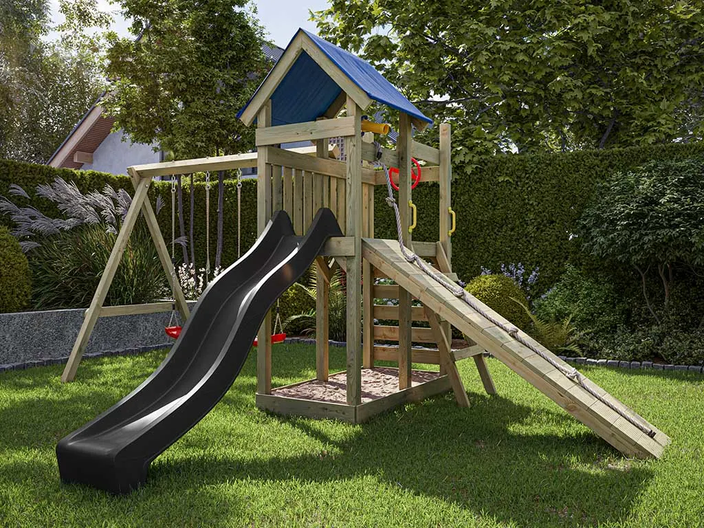 • Inklusive Rutsche in Grau mit 9 x 9 cm starkem Schaukelbalken.