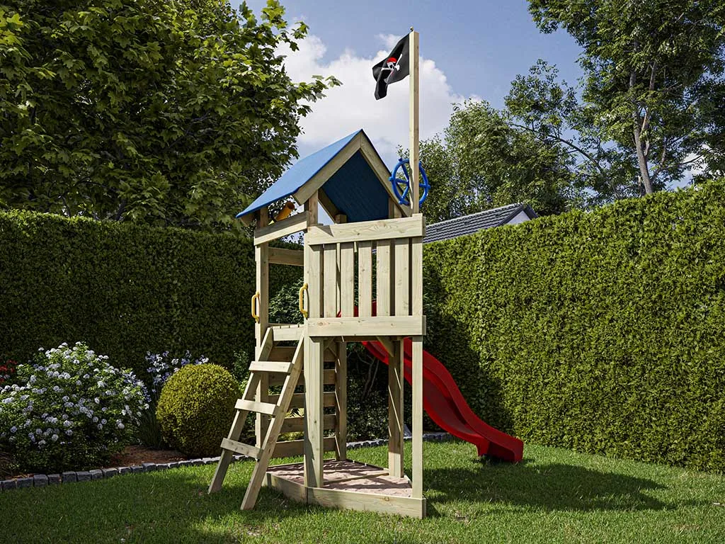 Für kleine Entdecker und große Piraten bietet dir der Spielturm eine Captain Jolly Flagge. Dieser Name ist das berühmte Symbol für alle Piraten. Aus der Ferne erkennbar und der Traum eines jeden Piraten unter einem zu segeln. Das große Schiff mit seinen 313 x 156 x 250 cm, bietet ein Dach, um vor der rauen See zu schützen und unbekannte Inseln auch bei Stürmen zu finden. Die Aussichtsplattform wurde dafür auf 122 cm Höhe angesetzt. Um sich schnell ins Abenteuer zu stürzen findet sich eine blaue Rutsche am Backbord (links). Doch um wieder schnell in See zu stechen ist eine Kletterwand am Heck des Schiffes oder eine Leiter an der Steuerbord Seite.