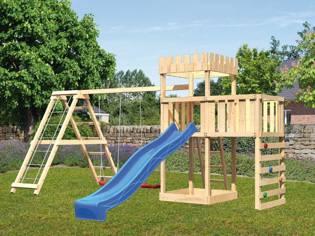 • Spielturm Löwenherz, inkl. Doppel Klettergerüst, Anbauplattform, Kletterwand, Rutsche blau