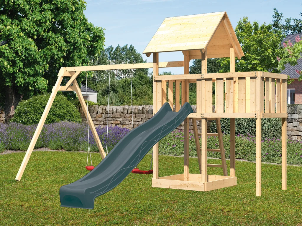 Spielturm Set Lotti naturbelassen inkl. Rutsche anthrazit + Doppelschaukel + Anbauplattform