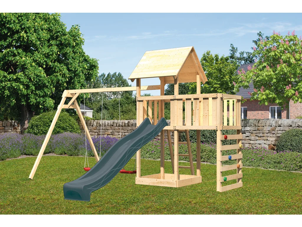 Spielturm Set Lotti naturbelassen inkl. Rutsche anthrazit + Doppelschaukel + Anbauplattform + Kletterwand