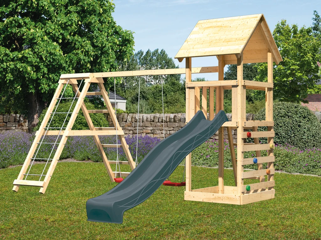 Spielturm Set Lotti naturbelassen inkl. Rutsche anthrazit + Doppelschaukelanbau Klettergerüst