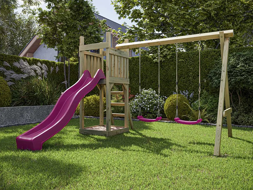 Dieser Spielturm ist aus Holz gefertigt. Der Naturstoff ist das perfekte Material für Kinderspielgeräte – strapazierfähig und beständig. Für die Herstellung wurde erstklassiges Kiefernholz verwendet, welches durch seine Widerstandsfähigkeit und Robustheit punktet.