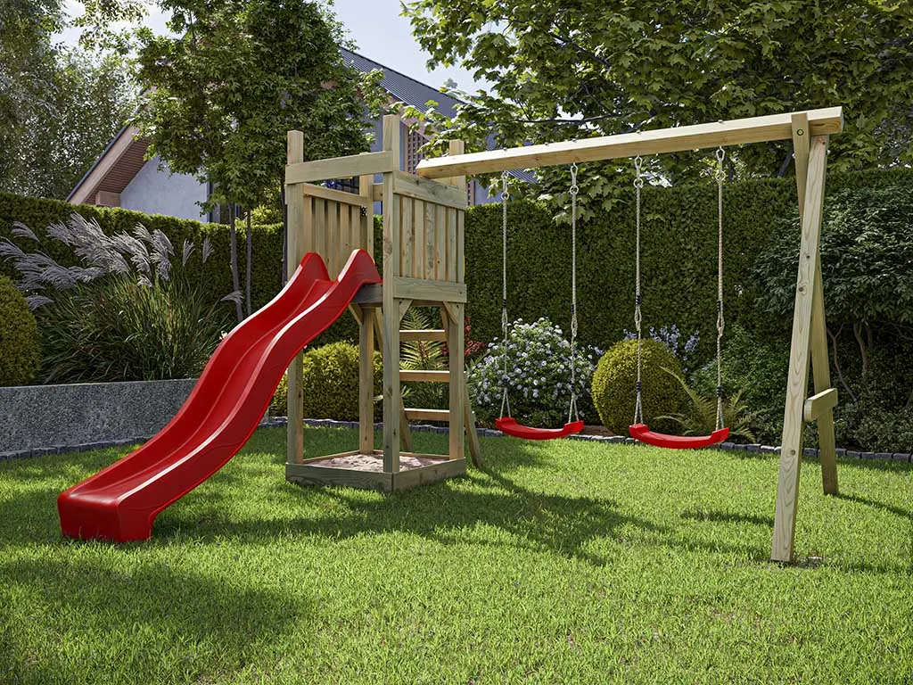 Dieser Spielturm ist aus Holz gefertigt. Der Naturstoff ist das perfekte Material für Kinderspielgeräte – strapazierfähig und beständig. Für die Herstellung wurde erstklassiges Kiefernholz verwendet, welches durch seine Widerstandsfähigkeit und Robustheit punktet.