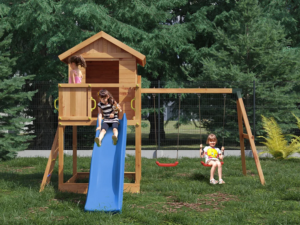 Spielturm mit Podest, Doppelschaukel und Leiter
