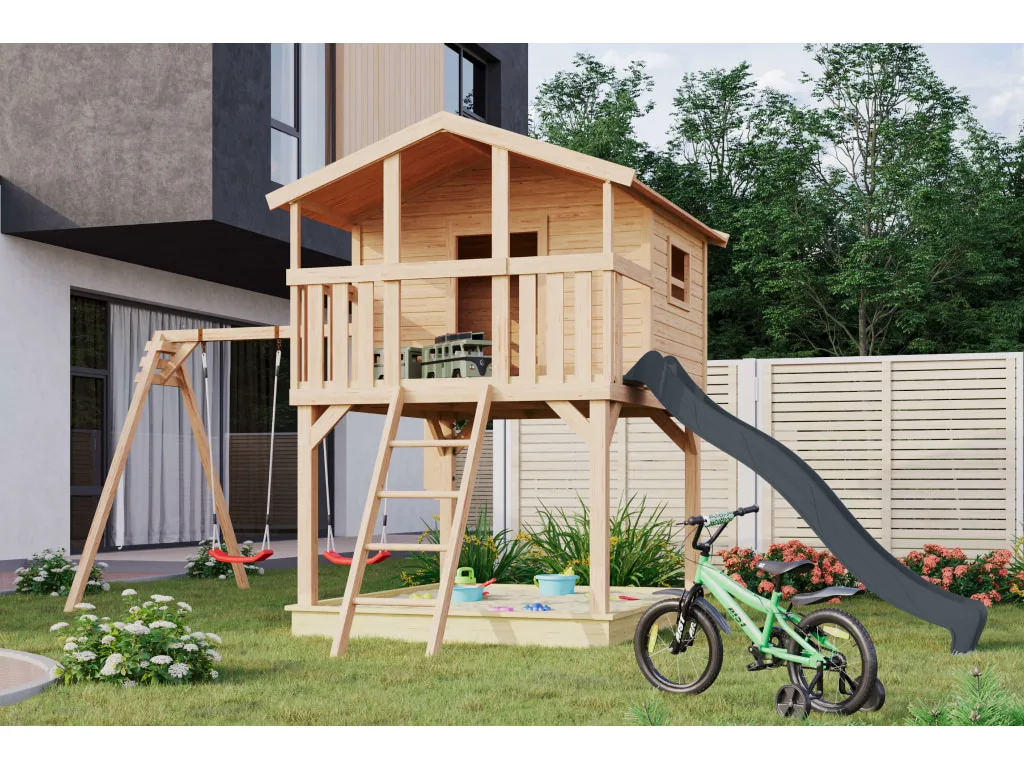 Stelzenhaus Benjamin SET 19 mm naturbelassen inkl. Rutsche anthrazit + Doppelschaukelanbau
