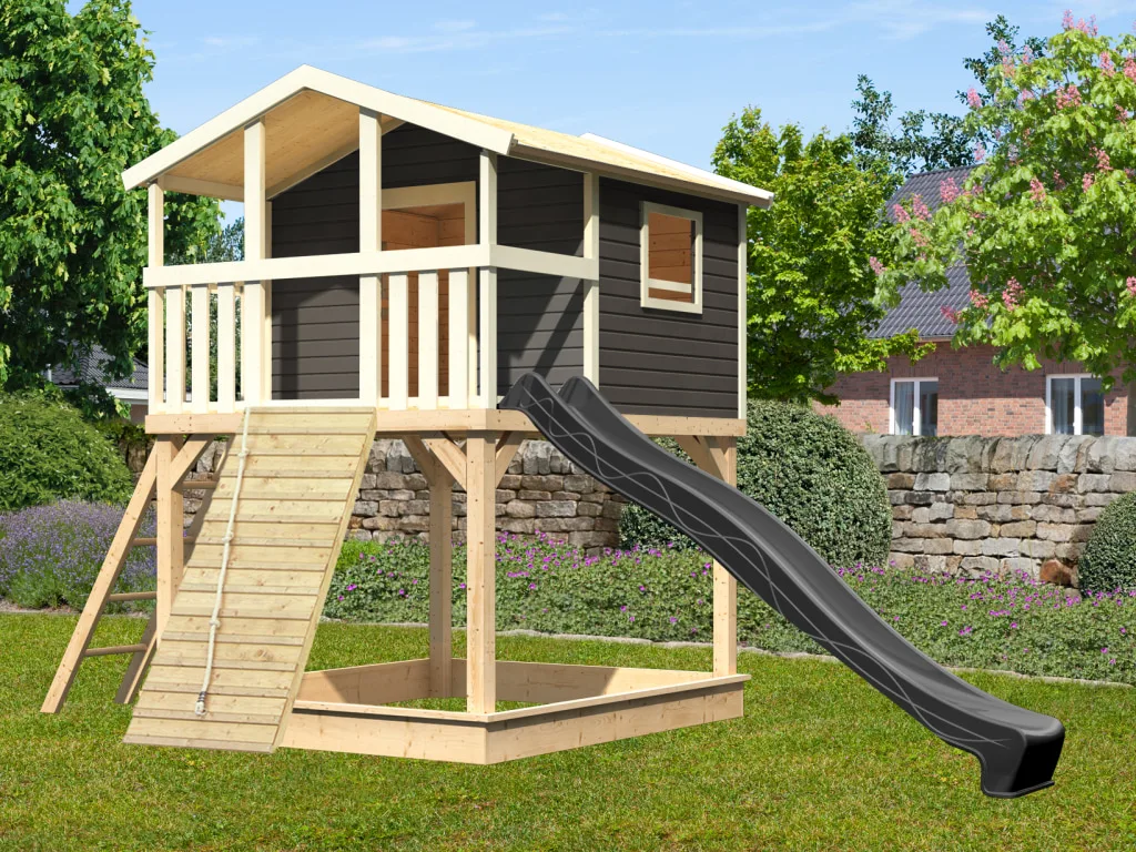 Stelzenhaus Benjamin SET 19 mm terragrau inkl. Rutsche anthrazit + Holzrampe