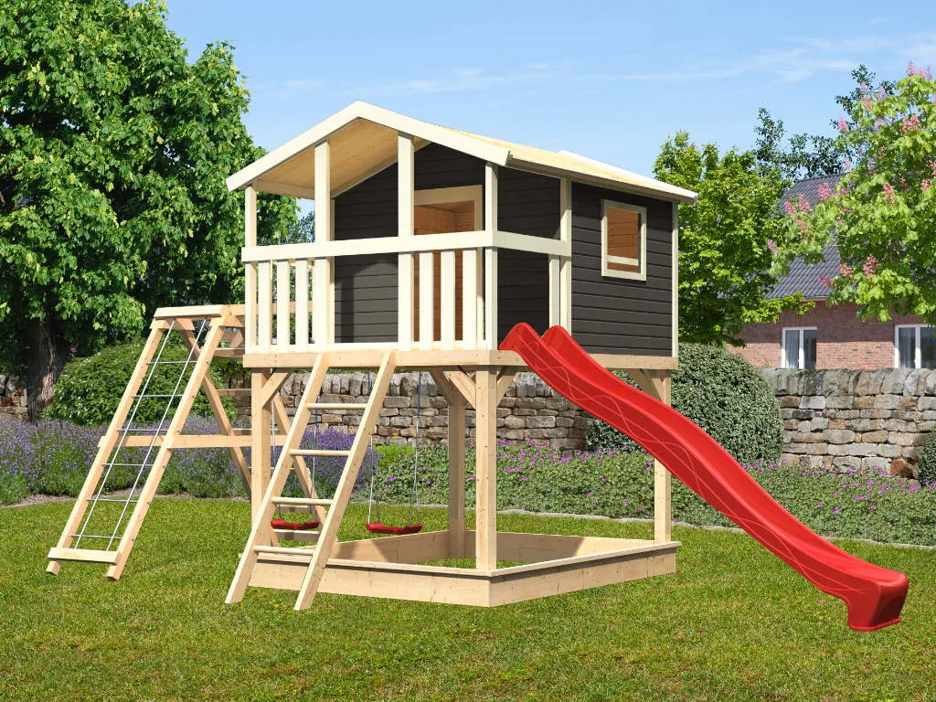 Nicht für Kinder unter 3 Jahren geeignet. Geeignet für Kinder von 3 bis 14 Jahren. Benutzung nur unter unmittelbarer Aufsicht von Erwachsenen. Stolper- und/oder Sturzgefahr. Nur für den häuslichen, privaten Bereich (DIN EN 71-8). Ausschließlich für die Verwendung im Freien. Spieltürme/Stelzenhäuser mit einer Spielhöhe von über 60 cm müssen auf einer weichen Unterlage wie Gras oder Holzspänen aufgestellt werden. Bei Spieltürmen/Stelzenhäusern mit einer Spielhöhe unter 60 cm wird eine weiche Unterlage ebenfalls empfohlen. Die Grundkonstruktion ist in regelmäßigen Abständen auf etwaige Beschädigung und Fäulnisbefall zu kontrollieren. Um die Stabilität zu gewährleisten, müssen die Pfosten im Boden verankert werden. Die Schraubverbindungen sind in regelmäßigen Abständen (ca. 4 Wochen, je nach Benutzungshäufigkeit und Alter des Spielgerätes) auf festen Sitz und Stabilität zu überprüfen. Die angegebenen Maße können geringfügig abweichen.
